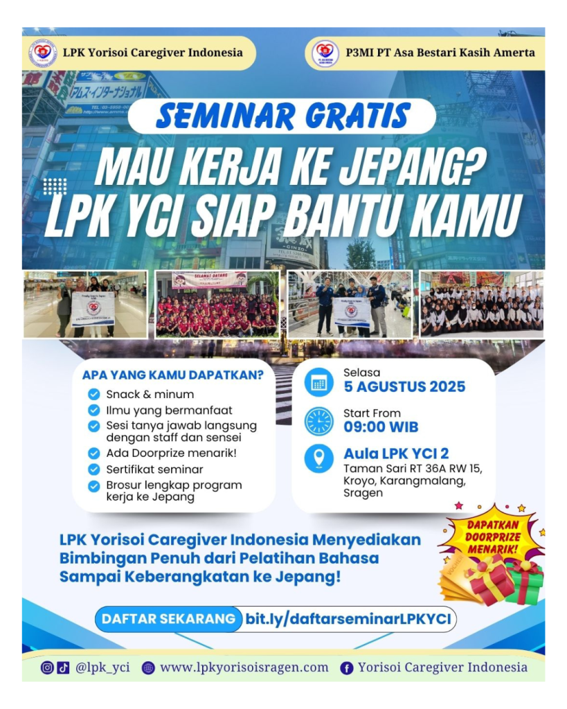 Bekerja di luar negeri, khususnya di Jepang, menjadi impian banyak generasi muda Indonesia. Peluang kerja di negeri sakura terbuka lebar, terutama di bidang caregiving dan layanan sosial. Untuk menjawab tingginya minat masyarakat serta memberikan informasi akurat seputar peluang kerja di Jepang, LPK Yorisoi Caregiver Indonesia bekerja sama dengan P3MI PT Asa Bestari Kasih Amerta, akan menyelenggarakan seminar gratis bertema “Mau Kerja ke Jepang? LPK YCI Siap Bantu Kamu”.